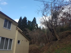 今回の現場は美術館の建物の裏側斜面から生えている樹木の伐採と枝落としです。かなり伸びてきて建物の屋根にかかってきていたので伐採することになりました。